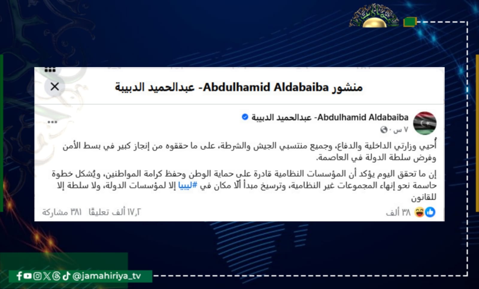 وأوضح إن ما تحقق اليوم يؤكد أن المؤسسات النظامية قادرة على حماية الوطن وحفظ كرامة المواطنين، ويُشكل خطوة حاسمة نحو إنهاء المجموعات غير النظامية، وترسيخ مبدأ ألّا مكان في ليبيا إلا لمؤسسات الدولة، ولا سلطة إلا للقانون.
