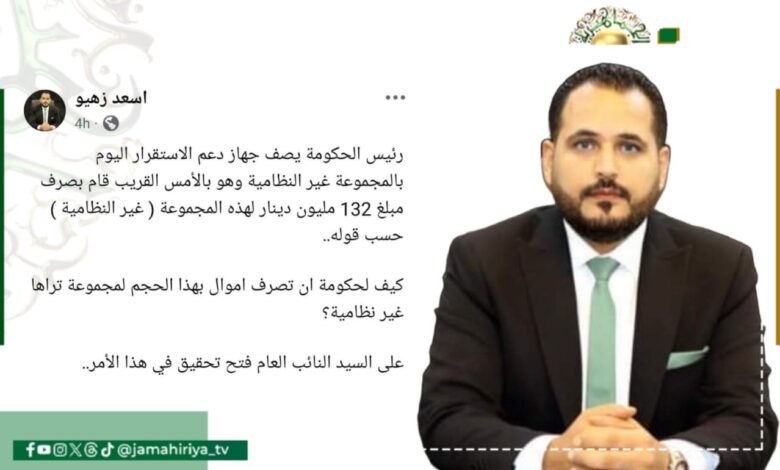 وقال زهيو، في منشور على صفحته بموقع التواصل الاجتماعي ” فيسبوك”: إن وصف الدبيبة جهاز دعم الاستقرار بالمجموعة غير النظامية، وهو بالأمس القريب قام بصرف مبلغ 132 مليون دينار لهذه المجموعة، فكيف لحكومة أن تصرف أموال بهذا الحجم لمجموعة تراها غير نظامية؟!
