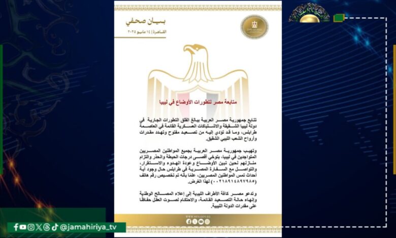 عاجل// مصر تدعو كافة الأطراف الليبية إلى إعلاء المصالح الوطنية وإنهاء حالة التصعيد والاحتكام لصوت العقل.