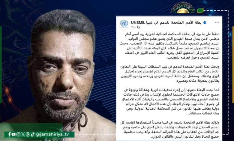 جددت البعثة الأممية التأكيد على أهمية الإسراع في التحقيق الذي يجريه النائب العام في اختفاء إبراهيم الدرسي مؤكدة أن صحة التسجيل لم تعد محل شك.