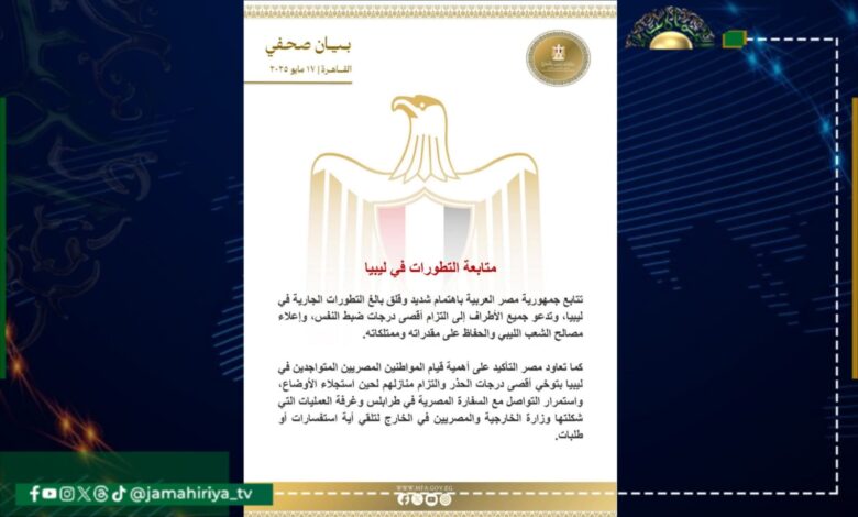 أعربت مصر عن قلقها البالغ للتطورات الأخيرة في ليبيا، مُشددةً على ضرورة التزام كافة الأطراف بأقصى درجات ضبط النفس، ووضع المصلحة العليا للشعب الليبي فوق أي اعتبارات أخرى.