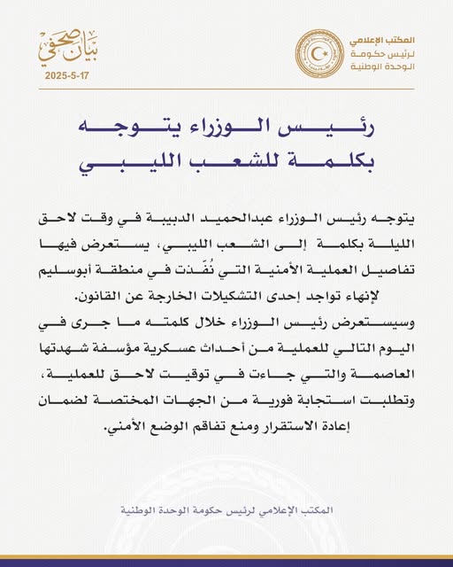 عاجل// الدبيبة يستعرض خلال كلمته ما جرى في اليوم التالي للعملية الأمنية في منطقة أبو سليم من أحداث عسكرية شهدتها العاصمة