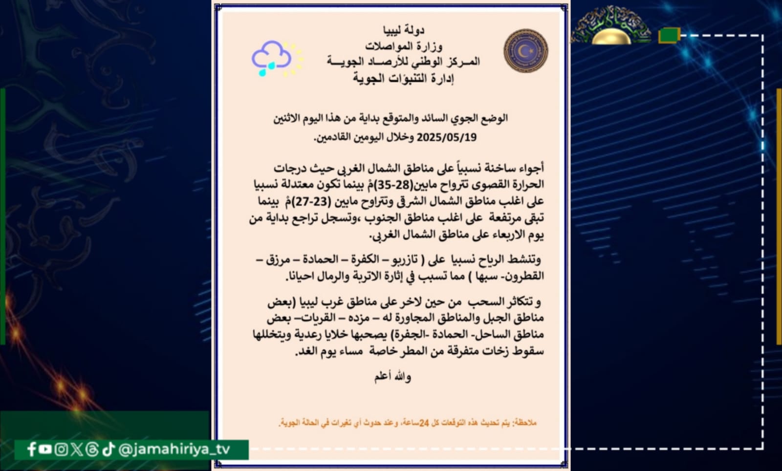 وجاء بيان الأحوال الجوية المتوقعة على ليبيا اليوم كالتالي