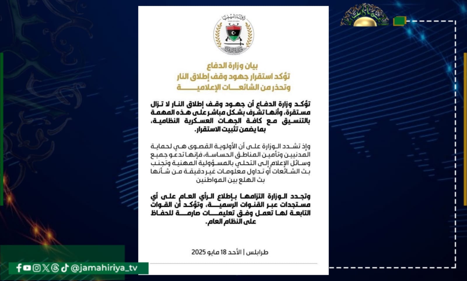 قالت وزارة الدفاع، التابعة لحكومة التطبيع بقيادة عبد الحميد الدبيبة، أن جهود وقف إطلاق النار لا تزال مستقرة، وأنها تشرف بشكل مباشر على هذه المهمة بالتنسيق مع كافة الجهات العسكرية النظامية، بما يضمن تثبيت الاستقرار.