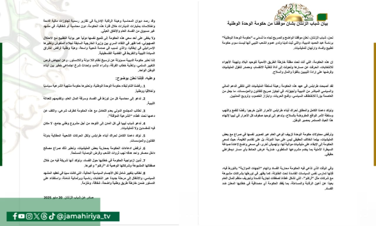 أعلن شباب الزنتان موقفهم من حكومة التطبيع، حيث أكدوا في بيان لهم إنها تحولت إلى أداة لتغذية الانقسام، ومصدر لتغول المليشيات وفرضها على إرادة الليبيين بالقوة والمال والسلاح.