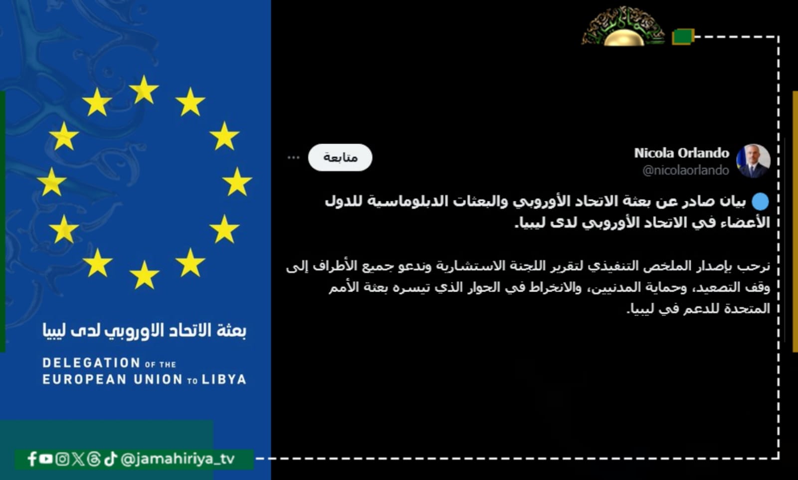 واختتم بيانه بالتأكيد أن الاتحاد الأوروبي ودوله الأعضاء سيظلوا ثابتين في دعمهم لليبيا ولبعثة الأمم المتحدة، في تعزيز المصالحة الوطنية والوحدة المؤسسية والحوار الشفاف والشامل الذي يرتكز على الملكية الليبية والتوافق.