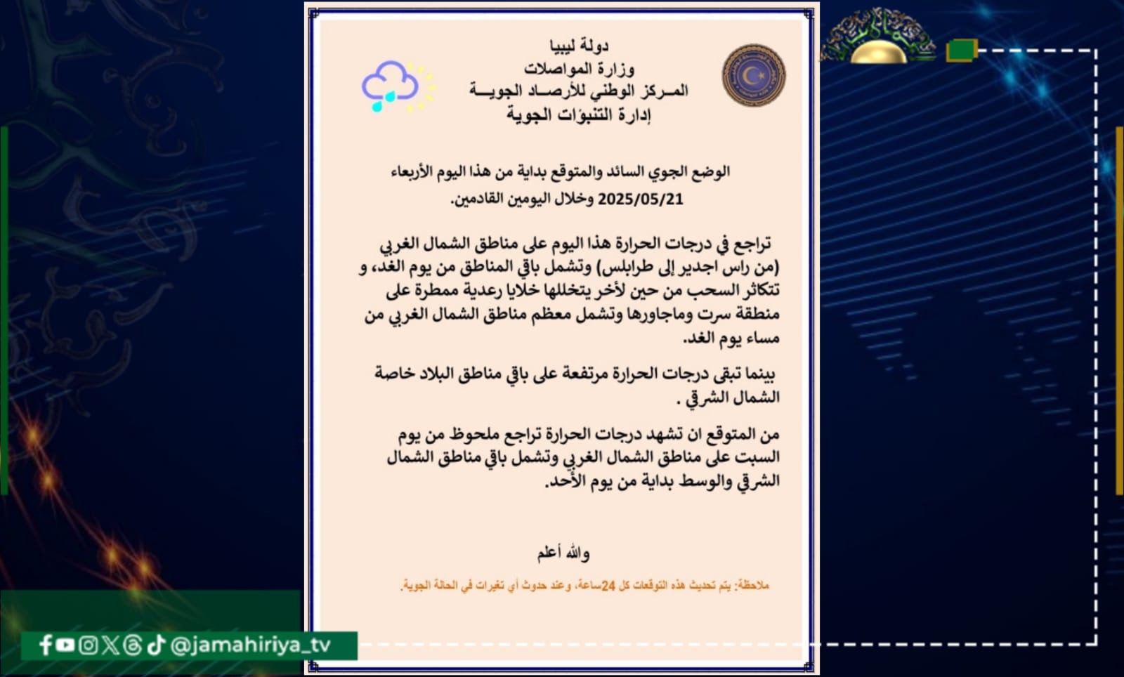 وجاء بيان الأحوال الجوية المتوقعة على ليبيا اليوم كالتالي:-