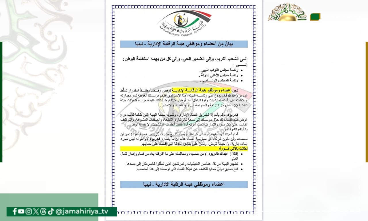 وأكد الأعضاء أن قادربوه حوّل المؤسسة إلى ساحة للرشاوي المُقنّعة، والصفقات المشبوهة، والتوظيف الفاسد، حتى بات مدراء الإدارات تحت إمرته، أداة لتنفيذ أجندات المليشيات.