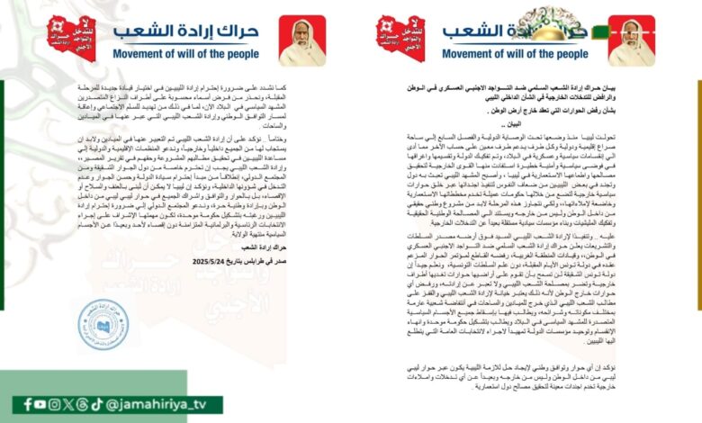 وأكد البيان، أن أي حوار وتوافق وطني لإيجاد حل للازمة الليبية يكون عبر حوار ليبي ليبي من داخل الوطن وليس من خارجه وبعيداً عن أي تدخلات خارجية، مشددا على ضرورة احترام إرادة الليبيين في اختيار قيادة جديدة للمرحلة المقبلة، محذرا من فرض أسماء محسوبة على أطراف النزاع.
