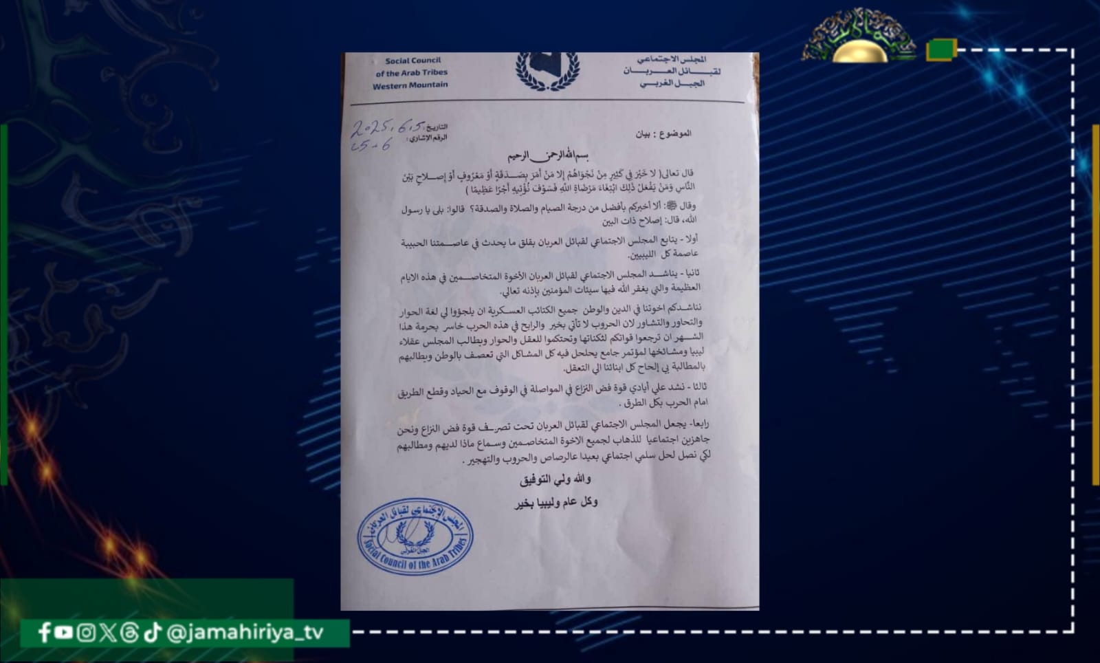 دعا المجلس الاجتماعي لقبائل العربان في الجبل الغربي ضرورة حل المشاكل بين الميليشيات في طرابلس سلميا، واللجوء للغة الحوار لأن الحروب لا تأتي بالخير.