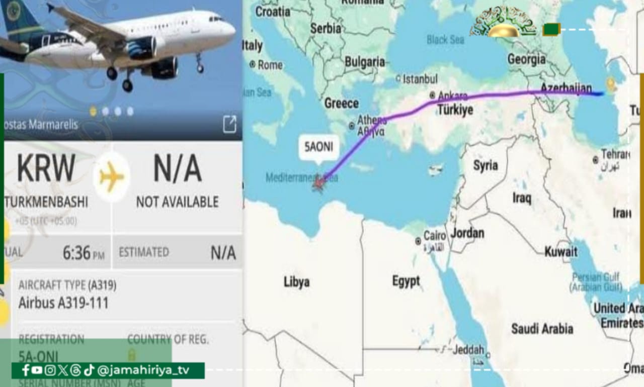 وقال الموقع إن الطائرة الحكومية التي تحمل رقم التسجيل 5A-ONI أقلعت صباح اليوم من مطار معيتيقة الدولي بطرابلس متجهة إلى مطار تركمانباشي في دولة تركمانستان.