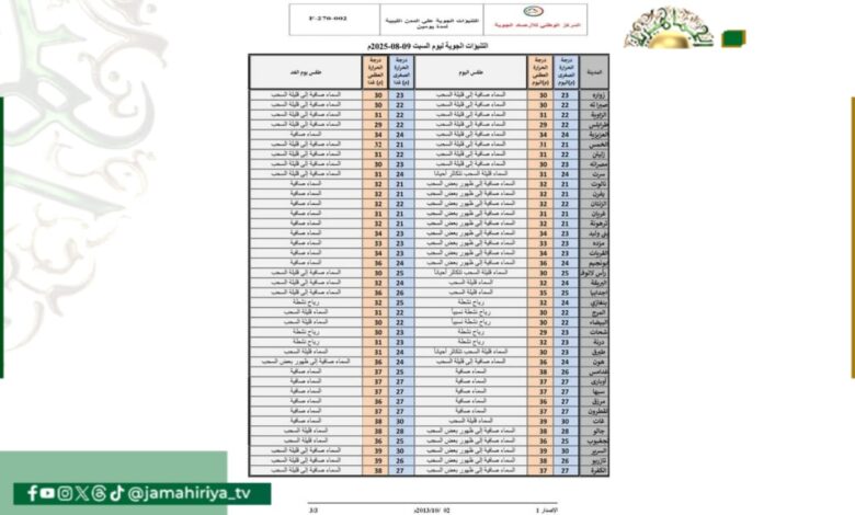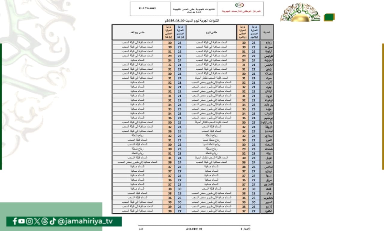 توقع مركز الأرصاد الجوية أن تسود أجواء صيفية معتدلة على معظم مناطق البلاد حيث درجات الحرارة ضمن معدلها لهذا الشهر(اغسطس) وتتراوح خلال فترات النهار على المناطق الساحلية مابــــــــين (29–34)مْ مع زيادة في عامل الرطوبة, ومابين (36–39)مْ على مناطق الدواخل و الجنوب.