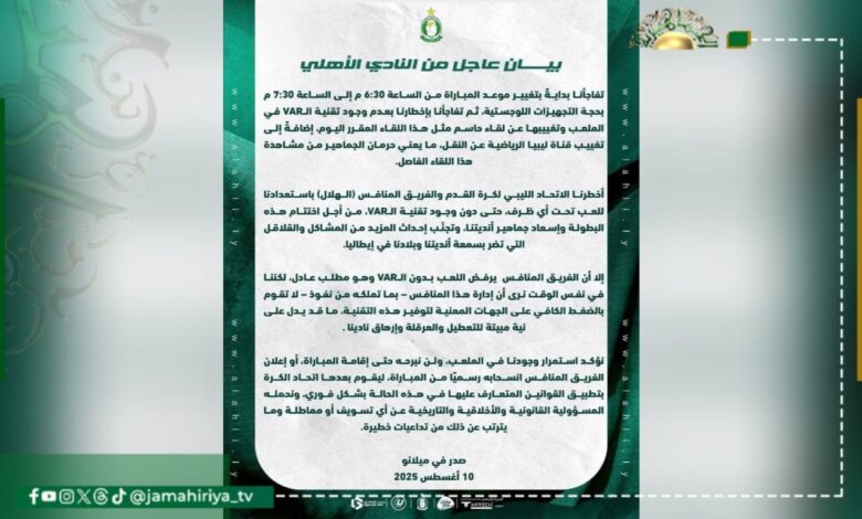 وحمل النادي الاتحاد الليبي لكرة القدم والجهات المعنية المسؤولية الكاملة عن أي تأجيل أو تعطيل قد يطرأ نتيجة لهذا الموقف، مؤكداً تمسكه بحقوقه التنظيمية والفنية في هذه المباراة المصيرية.