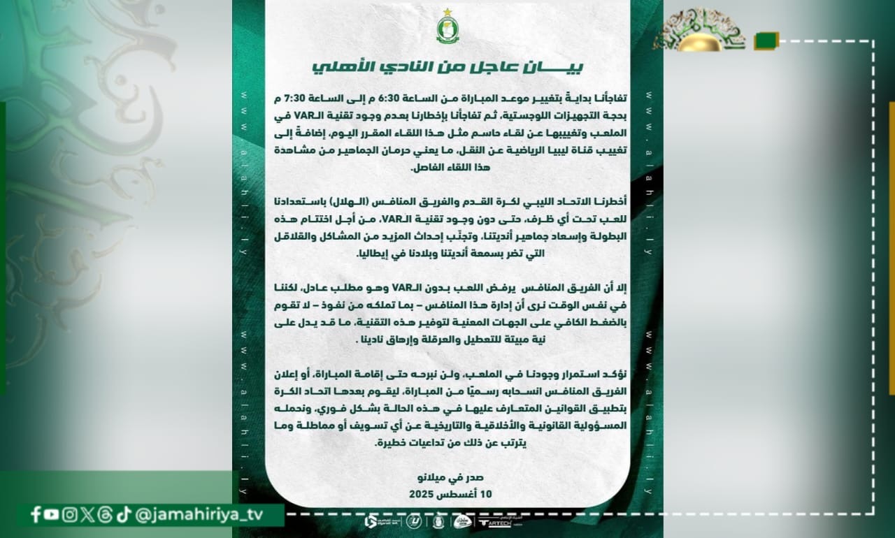 وأوضح الأهلي طرابلس أنه تفاجأ بدايةً بتغيير موعد المباراة بحجة التجهيزات اللوجيستية، ثم تلقى إخطاراً بعدم توفر تقنية VAR في الملعب، إلى جانب غياب قناة ليبيا الرياضية عن نقل اللقاء، ما اعتبره حرماناً للجماهير من متابعة هذا الحدث الكروي الفاصل.