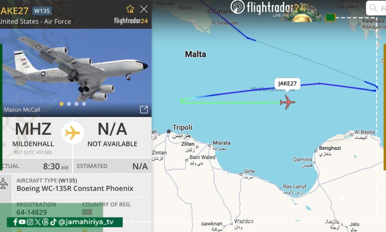 الطائرة، التي تحمل رقم التسجيل 64-14829، أقلعت من قاعدة ميلدنهال الجوية الملكية في سوفولك بالمملكة المتحدة، متجهة نحو المجال الجوي الليبي، في تحرك يثير تساؤلات حول طبيعة المهمة وأهدافها.