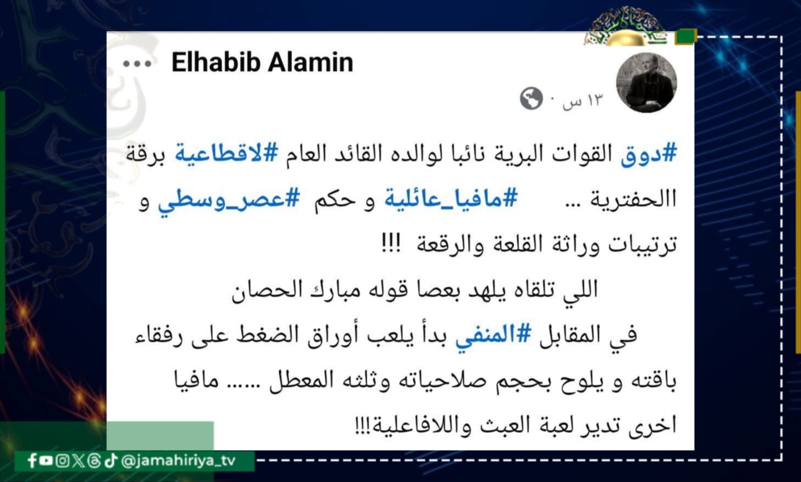 انتقد الحبيب الأمين قرار المواطن الأمريكي، خليفة حفتر، بتعيين نجله صدام نائباً له، واصفاً الخطوة بأنها تكريس لـ”حكم عائلي” وأسلوب “عصر وسطي”.