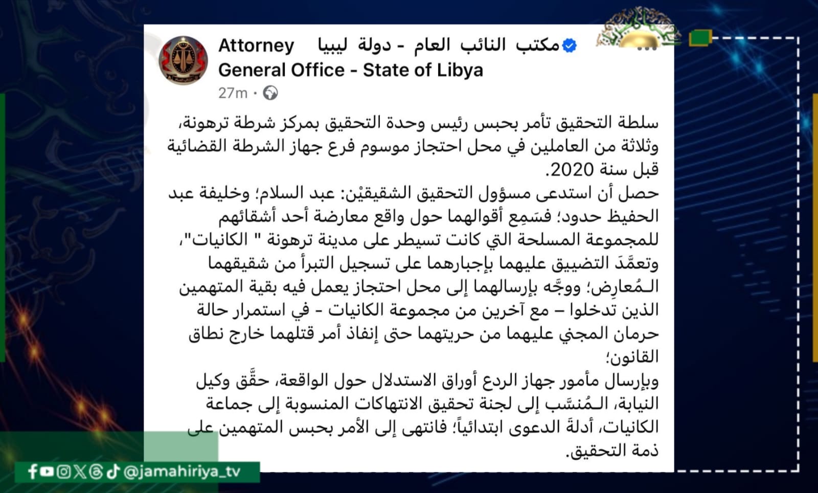 الرئيسية/محلي/عاجل| النيابة العامة تأمر بحبس رئيس وحدة التحقيق بمركز شرطة ترهونة وثلاث من العاملين في فرع جهاز الشرطة القضائية ترهونة قبل سنة 2020 لقتلهم الشقيقين عبد السلام وخليفة عبد الحفيظ حدود خارج نطاق القانون محلي عاجل| النيابة العامة تأمر بحبس رئيس وحدة التحقيق بمركز شرطة ترهونة وثلاث من العاملين في فرع جهاز الشرطة القضائية ترهونة قبل سنة 2020 لقتلهم الشقيقين عبد السلام وخليفة عبد الحفيظ حدود خارج نطاق القانون 15 أغسطس، 2025 15 أغسطس، 2025 فيسبوك تويتر بينتيريست واتساب تيلقرام ڤايبر مشاركة عبر البريد طباعة