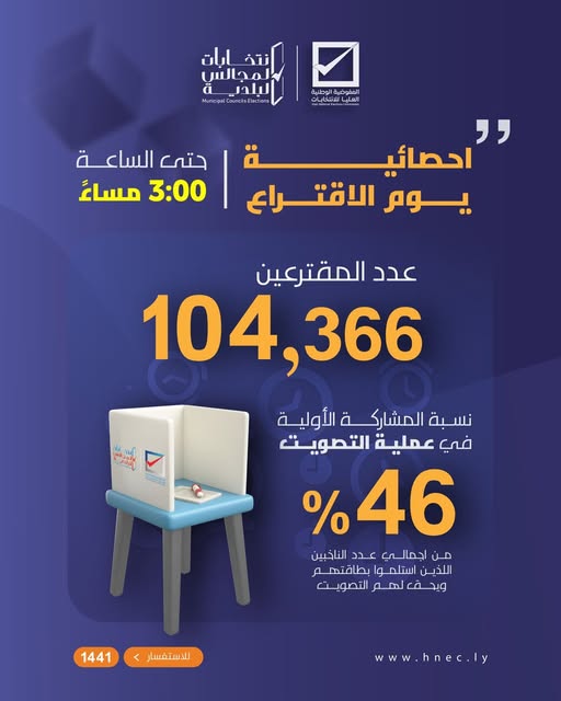 عاجل// المفوضية: عدد المقترعين بلغ 104.366 ناخب بنسبة مشاركة أولية وصلت 46% في انتخابات المجموعة الثانية للمجالس البلدية.