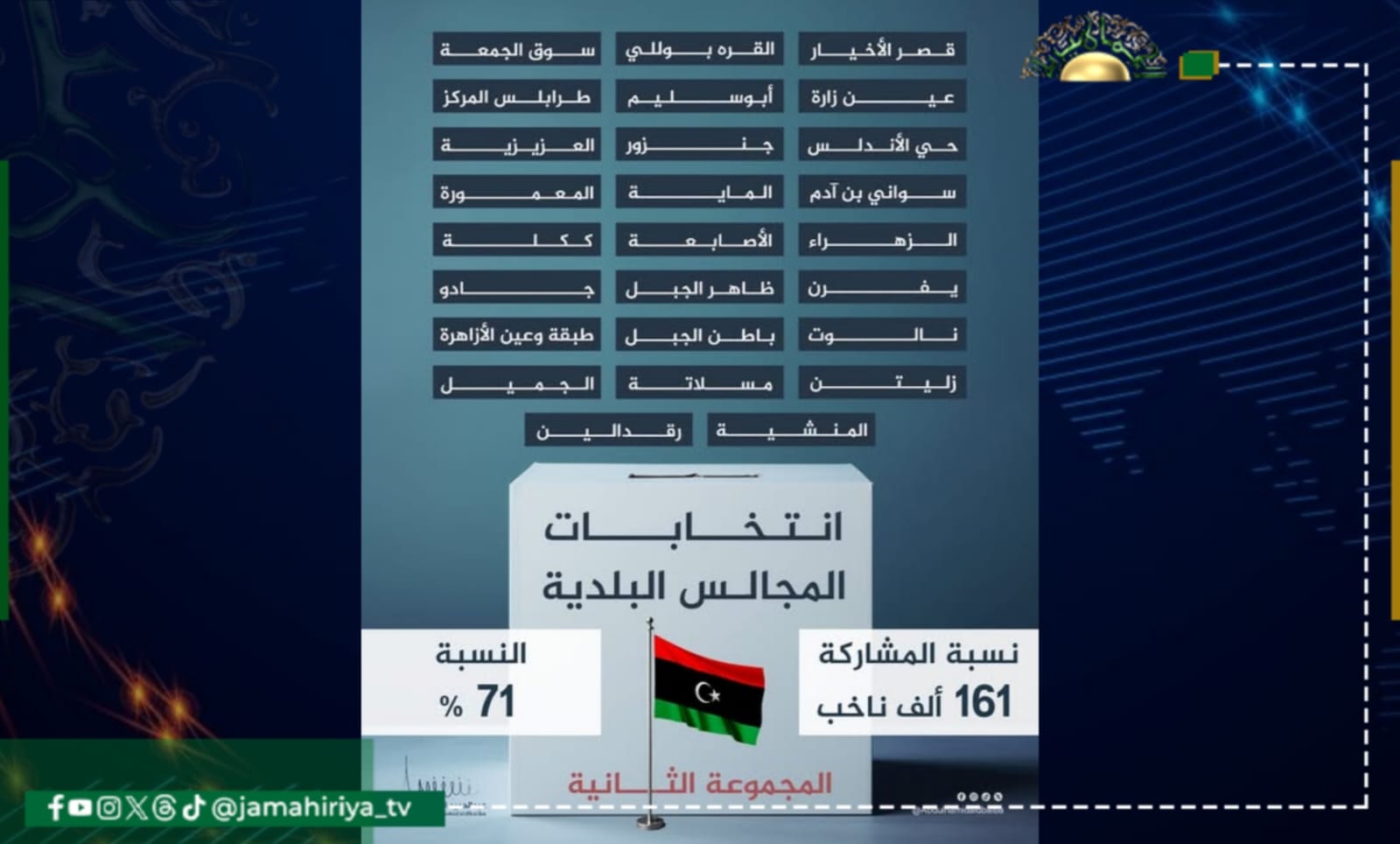 بارك عبد الحميد الدبيبة، رئيس وزراء حكومة التطبيع، نجاح الانتخابات البلدية التي أجريت في 26 بلدية ضمن المجموعة الثانية. وأشاد الدبيبة بجهود وزارة الداخلية التي أمنت سير الانتخابات بسلاسة ودون أي خروقات أمنية.
