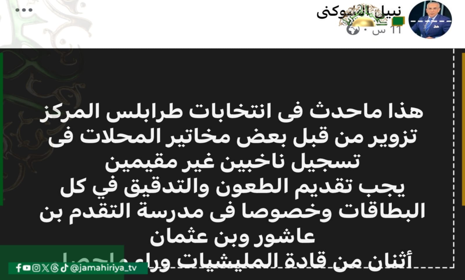كشف الإعلامي نبيل السوكني، عضو لجنة تواصل طرابلس، عن وجود تجاوزات خطيرة في انتخابات طرابلس المركز، مؤكدًا أن اثنين من قادة المليشيات يقفان وراء عمليات التزوير.