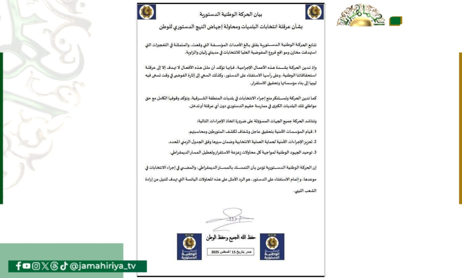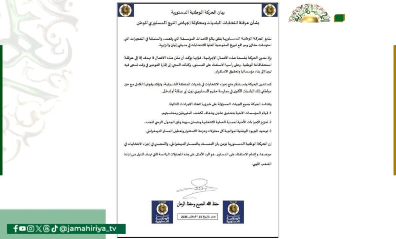وشدد البيان، على أن منع إجراء الانتخابات في عدد من بلديات المنطقة الشرقية يمثل انتهاكًا واضحًا لحق المواطنين في ممارسة حقهم الدستوري، مؤكدة وقوفها الكامل مع أبناء هذه البلديات في مواجهة أي محاولات للعرقلة أو التدخل غير المشروع.