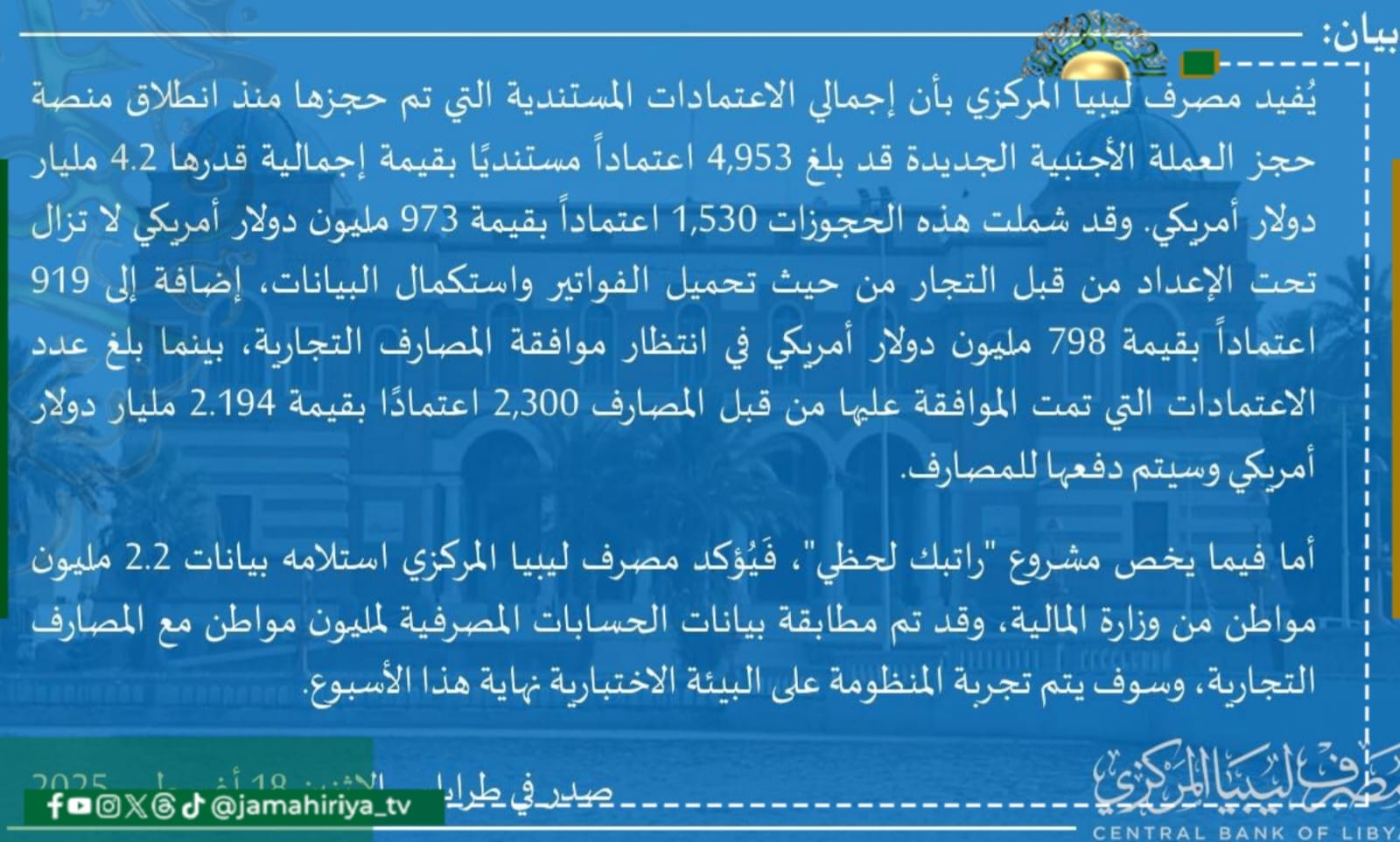 عاجل// المصرف المركزي: استلام بيانات 2.2 مليون مواطن من وزارة المالية في مشروع راتبك لحظي ومطابقة هذه البيانات المصرفية للمستفيدين مع المصارف التجارية