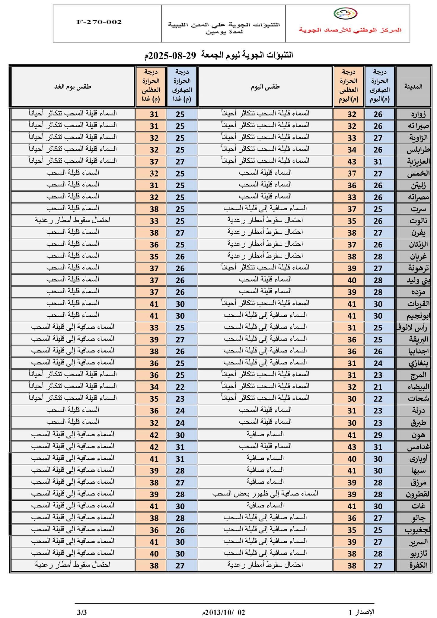 ولا زالت السحب تتكاثر على المناطق الحدودية مع دولتي تشاد والسودان (جبال العوينات وماجاورها- ومعطن السارة) يصحبها خلايا رعدية ممطرة وتشمل من يوم الغد (الكفرة وماجاورها-ربيانة- جبال تبستى) يصحبها أيضاً خلايا رعدية ممطرة مما تسبب فى جريان وسيول بعض الأودية، عليه التنبه لذلك.