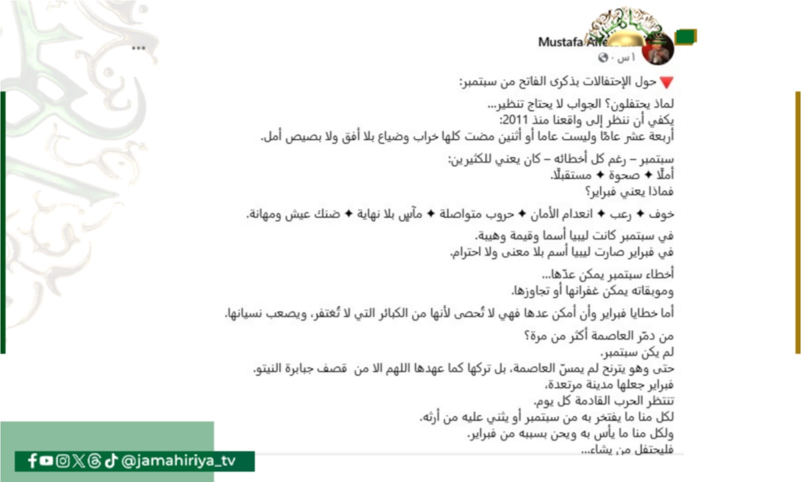 الفيتوري حول الاحتفالات بثورة الفاتح: الجواب لا يحتاج إلى تنظير بعد 14 عاما خراب وضياع بلا أفق
