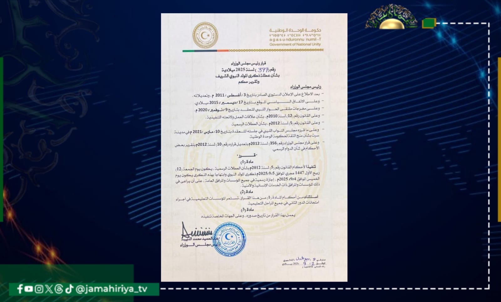 وحد الدبيبة يوم الخميس المقبل اجازة رسمية بمناسبة ذكرى المولد النبوي الشريف.