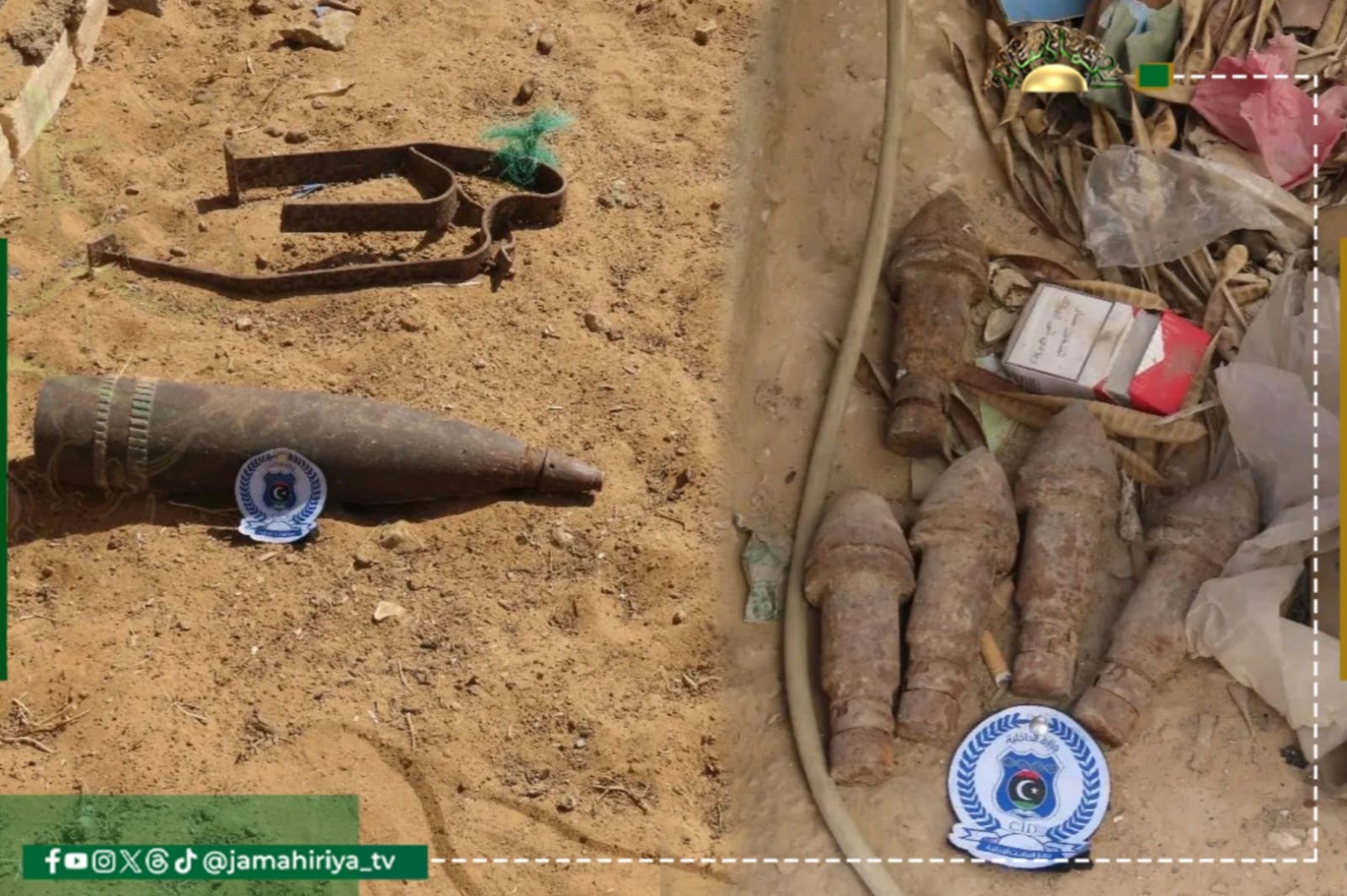 وأفاد جهاز المباحث الجنائية عبر صفحته الرسمية أن رؤوس القذائف المدفعية تم العثور عليها داخل قطعة أرض بمنطقة مشروع الهضبة قرب محطة وقود الشرارة، وذلك عقب بلاغ ورد من أحد المواطنين.