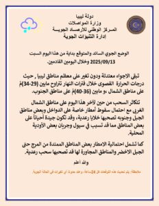 وجاء بيان الأحوال الجوية المتوقعة على ليبيا اليوم كالتالي: