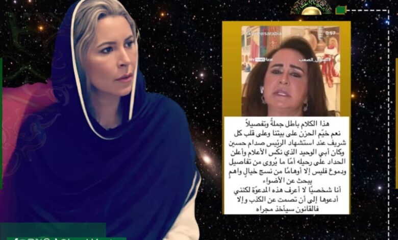 وقالت الدكتورة عائشة القذافي عبر حسابها على “إنستجرام” إن هذا الكلام باطل جملة وتفصيلاً، مؤكدة أن الحزن خيّم بالفعل على بيتها وعلى قلب كل شريف عند استشهاد الرئيس صدام حسين، مشيرة إلى أن والدها كان الوحيد الذي أمر بتنكس الأعلام وأعلن الحداد على رحيله.