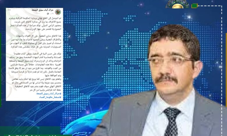 -أعلن حراك أبناء سوق الجمعة عن التوصل لاتفاق نهائي شامل برعاية الحكومة التركية لضمان استقرار العاصمة طرابلس ومنع الفوضى، يشمل جميع الأطراف المعنية ويلتزم الجميع بتنفيذه.