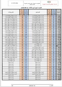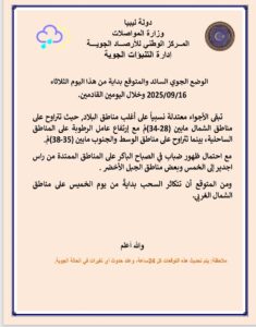 وأوضح المركز في نشرته الصادرة اليوم الثلاثاء 16 سبتمبر 2025، أن الطقس سيكون قليل السحب على معظم المناطق، مع احتمال تكوّن ضباب في ساعات الصباح الباكر على السواحل الممتدة من رأس اجدير إلى الخمس، وكذلك على بعض المرتفعات بالجبل الأخضر.