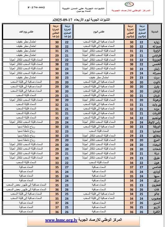 وجاء بيان الأحوال الجوية المتوقعة على ليبيا اليوم كالتالي:-