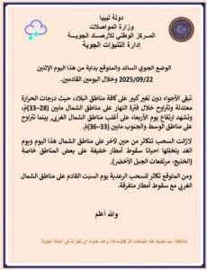 حالة السماء: قليلة السحب تتكاثر من حين لآخر خاصة على المناطق الممتدة من مصراته إلى سرت ومن ترهونة إلى بني وليد.