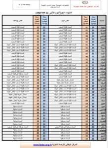 درجات الحرارة القصوى: تتراوح مابين (28-33)مْ وتسجل ارتفاع يوم الأربعاء.