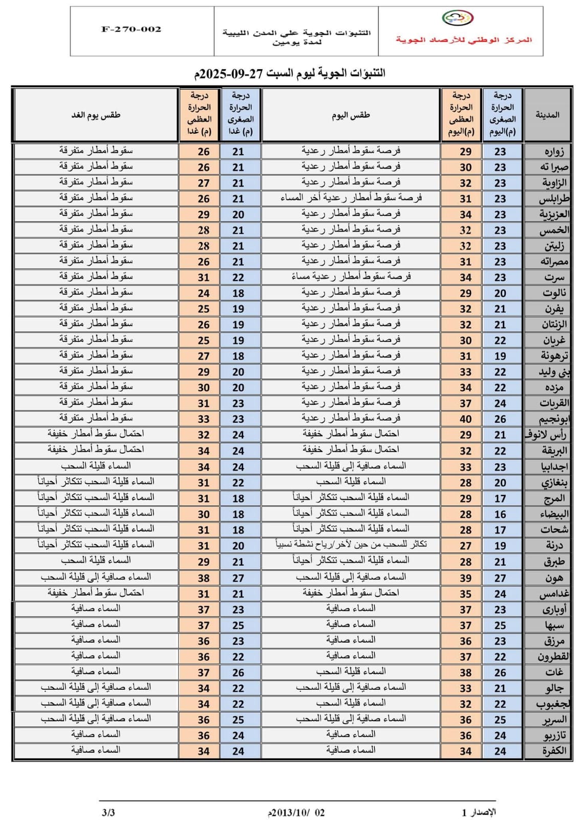أعلن مركز الأرصاد الجوية عن توقعات الأحوال الجوية في ليبيا خلال الثلاثة أيام المقبلة، محذراً من تكاثر السحب الرعدية وسقوط أمطار متوسطة إلى غزيرة على بعض المناطق.