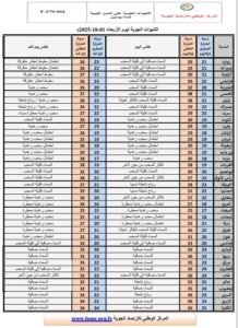 راس جدير حتى سرت – سهل الجفارة – الجبل الغربي: السماء قليلة السحب تتكاثر أحياناً، مع خلايا رعدية محتملة وسقوط أمطار متفرقة ابتداءً من الغد، والرياح متغيرة الاتجاه إلى شمالية غربية خفيفة إلى معتدلة تنشط مساء الغد على الساحل، ودرجات الحرارة تتراوح بين 28 و31°م وتسجل انخفاضًا من الغد.