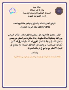 من المتوقع ان تكون الاجواء مستقرة نهاية الأسبوع على اغلب مناطق ليبيا.