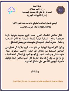 من المتوقع أن، تستقر الأجواء على جميع مناطق ليبيا مع نهاية الأسبوع، مع تحسن تدريجي في درجات الحرارة واستقرار نسبي في الرياح.