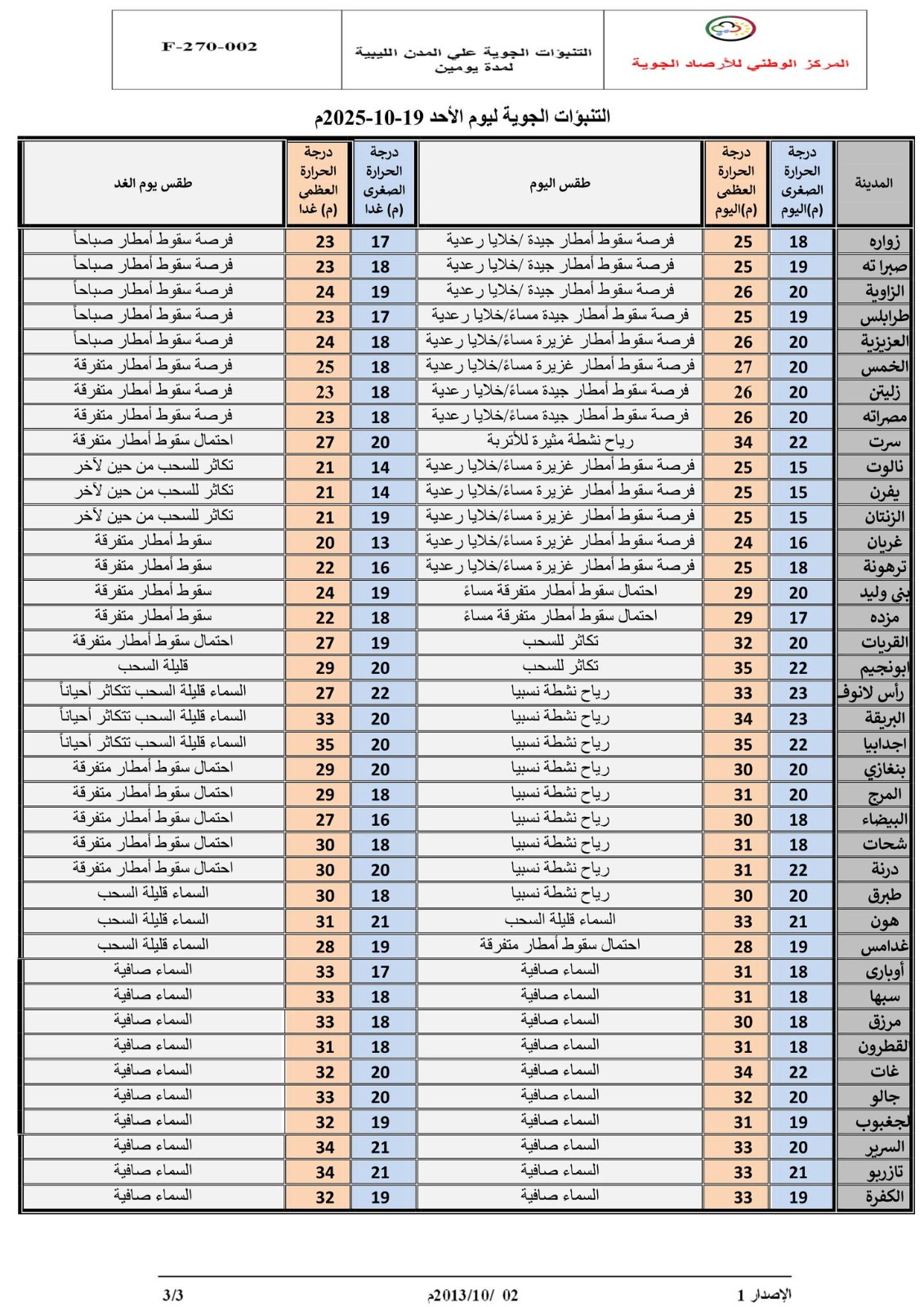 حالة السماء: فرصة لسقوط أمطار رعدية متوسطة الشدة على اغلب المناطق ومن المتوقع أن تكون غزيرة بداية من مساء هذا اليوم على بعض المناطق (من راس اجدير إلى مصراته -سهل الجفارة- ترهونة- أمسلاته وبني وليد – مناطق جبل نفوسة) ،مما تسبب في تجمع المياه في الأماكن المنخفضة وجريان بعض الأودية المحلية عليه يرجى التنبه لذلك ،وتنقشع السحب الممطرة تدريجيا من مساء يوم الغد.
