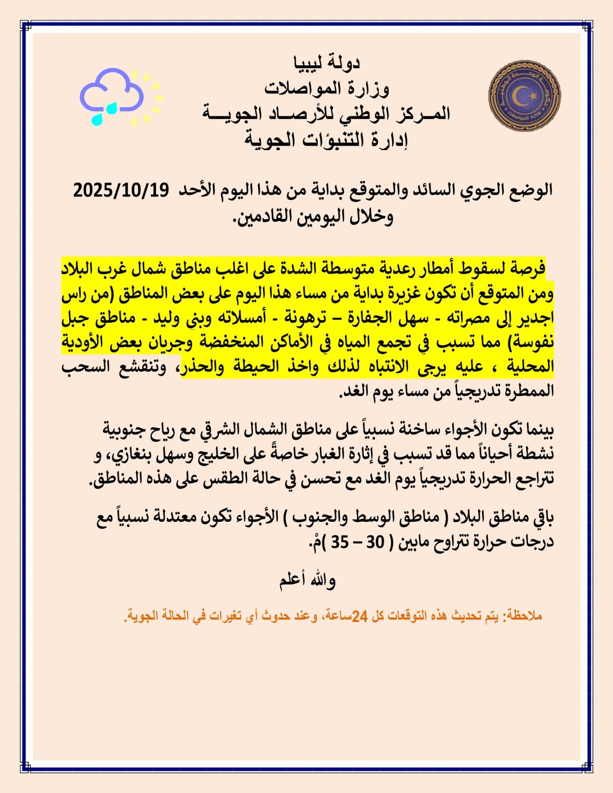 وجاء بيان الأحوال الجوية المتوقعة على ليبيا اليوم كالتالي