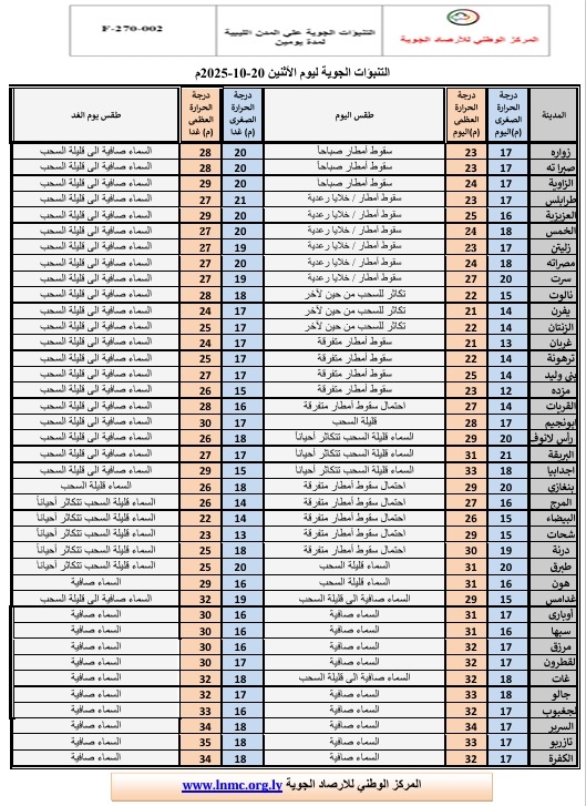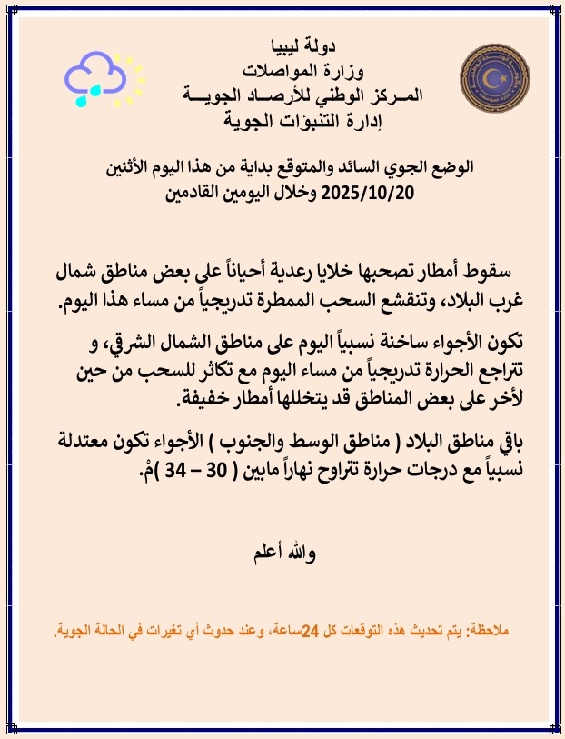 وجاء بيان الأحوال الجوية المتوقعة على ليبيا اليوم كالتالي:-