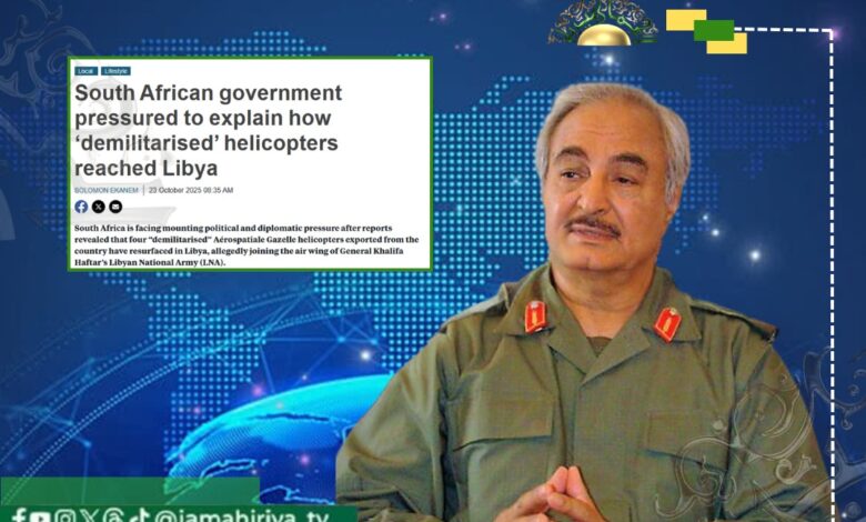 وبين التقرير، أن جنوب أفريقيا يواجه ضغوطا سياسية ودبلوماسية متزايدة بعد أن كشفت تقارير عن عودة أربع طائرات هليكوبتر “منزوعة السلاح” من طراز Aérospatiale Gazelle المصدرة من البلاد إلى ليبيا، حيث يُزعم أنها انضمت إلى الجناح الجوي لحفتر.