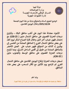 ورجح المركز بأن الطقس سيكون صافياً إلى قليل السحب من رأس جدير حتى سرت مروراً بسهل الجفارة والجبل الغربي، مع احتمال ظهور ضباب آخر الليل وخلال الصباح الباكر على المناطق الممتدة من الخمس إلى بوقرين. وتتراوح درجات الحرارة بين 27 و32 درجة مئوية، مع ارتفاع متوقع خلال اليومين المقبلين.