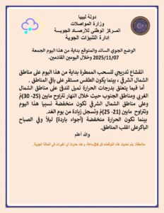 وأوضح المركز أن الأجواء ستكون صافية إلى قليلة السحب من رأس جدير حتى سرت مروراً بسهل الجفارة الجبل الغربي، مع رياح خفيفة إلى معتدلة تنشط خلال اليومين القادمين على مرتفعات الجبل الغربي، وتتراوح درجات الحرارة بين 25 و29 م°.