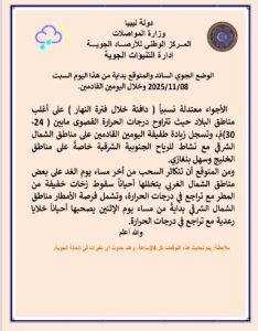 وجاء بيان الأحوال الجوية المتوقعة على ليبيا اليوم كالتالي:-