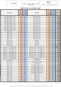 درجات الحرارة القصوى: تتراوح مابين (26-29)مْ، وتسجل زيادة طفيفة اليومين القادمين.