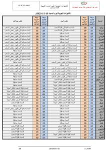 درجات الحرارة القصوى: تتراوح مابين (23-29)مْ، وتسجل زيادة طفيفة يوم الغد على بعض المناطق.